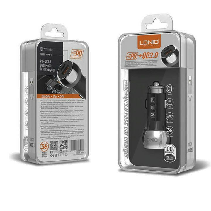 مدل C1 از سری شارژرهای《LDNIO》با استفاده از تکنولوژی شارژ سریع با توان 36 وات طراحی و ساخته شده است.با کمک این شارژر میتوانید موبایل یا تیلت خود را با سرعتی 80 درصد سریع تر از شارژرهای معمولی بدون هیچ گونه آسیب رسیدن به دستگاه خود شارژ کرده و در وقتتان صرفه جویی کنید.روی بدنه این شارژر یک درگاه USB با قابلیت فست شارژ(QC3.0) و یک در گاه USB-C با قابلیت PD وجود دارد.فناوری voltage boost هم یکی دیگر از قابلیت های C1 است که با تشخیص مقاومت کابل به بهینه شدن ولتاژ و در نهایت شارژ سریعتر دستگاه شما کمک میکند این دستگاه دارای چراغ LED است که در هنگام شب به راحتی بتوانید پورت های آن را پیدا کنید.این شارژر دارای قابلیت AUTO ID است یعنی ولتاژ و جریان را مناسب با دستگاه شما وارد آن میکند و آسیب رسیدن به باطری دستگاهتان جلوگیری میکند.ولتاژ ورودی این شارژر ۱۲-۲۴ ولت و ولتاژ خروجی متغیر بین ۵، ۹ و ۱۲ ولت است و شدت جریان خروجی ۳ آمپر در ولتاژ ۵ ولت، ۲ آمپر در ولتاژ ۹ ولت و ۱٫۵ آمپر در ولتاژ ۱۲ ولت است.این شارژر دارای یک کابل فست شارژ USB-C با روکش TPE با قابلیت فست شارژ و انتقال دیتا نیز هست.یکی از ویژگی های مهم این شارژر محافظت در برابر نوسانات جریان و ولتاژ برق است این شارژر دارای استاندارد های ایمنی و سلامت محصول CE، FCC و RoHs است جنس بدنه این شارژر از فلز مقاوم و پلاستیک فشرده است.