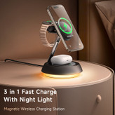 پایه شارژ 3 کاره مناسب برای اپل واچ ، ایرپاد اپل (یا هدفونهای مجهز به فناوری شارژ بیسیم) و تمامی تلفنهای مجهز به تکنولوژی شارژ بیسیم. در این محصول محلی برای قرار دادن گوشی تلفن،هدفونهای بیسیم با تکنولوژی شارژ بیسیم مانند ایرپاد و همچنین محلی مخصوص اپل واچ وجود دارد. محل قرار دادن اپل واچ طوری طراحی شده است که شما با قرار دادن ساعت خود میتوانید ساعت را در آن قرارداده و شارژ نمائید. این شارژر مجهز به درگاه TYPE-C میباشد که کابل مربوطه با بهترین کیفیت نیز درون جعبه دستگاه وجود دارد. حداکثر توان خروجی دستگاه 15 وات میباشد و البته از مقادیر پایینتر 5 یا 10 وات هم پشتیبانی میکند. در محل قرارگیری گوشی مگنت قرارداده شده که با وجود این ویژگی از شارژ سریعتر آیفونهای سری 12 میتوانید اطمینان حاصل نمائید. استند دارای سه کویل مغناطیسی قدرتمند است. این سه کویل علاوه بر قدرت بالایی که دارند کاملا مستقل از هم نیز عمل میکنند. بنابراین در فرایند شارژ همزمان هیچ اختلالی ایجاد نمیشود.در پایه زیرین نور لایت برای چراغ خواب قرار گرفته که علاوه بر زیبایی قابلیت این شارژر را ارتقا داده است.